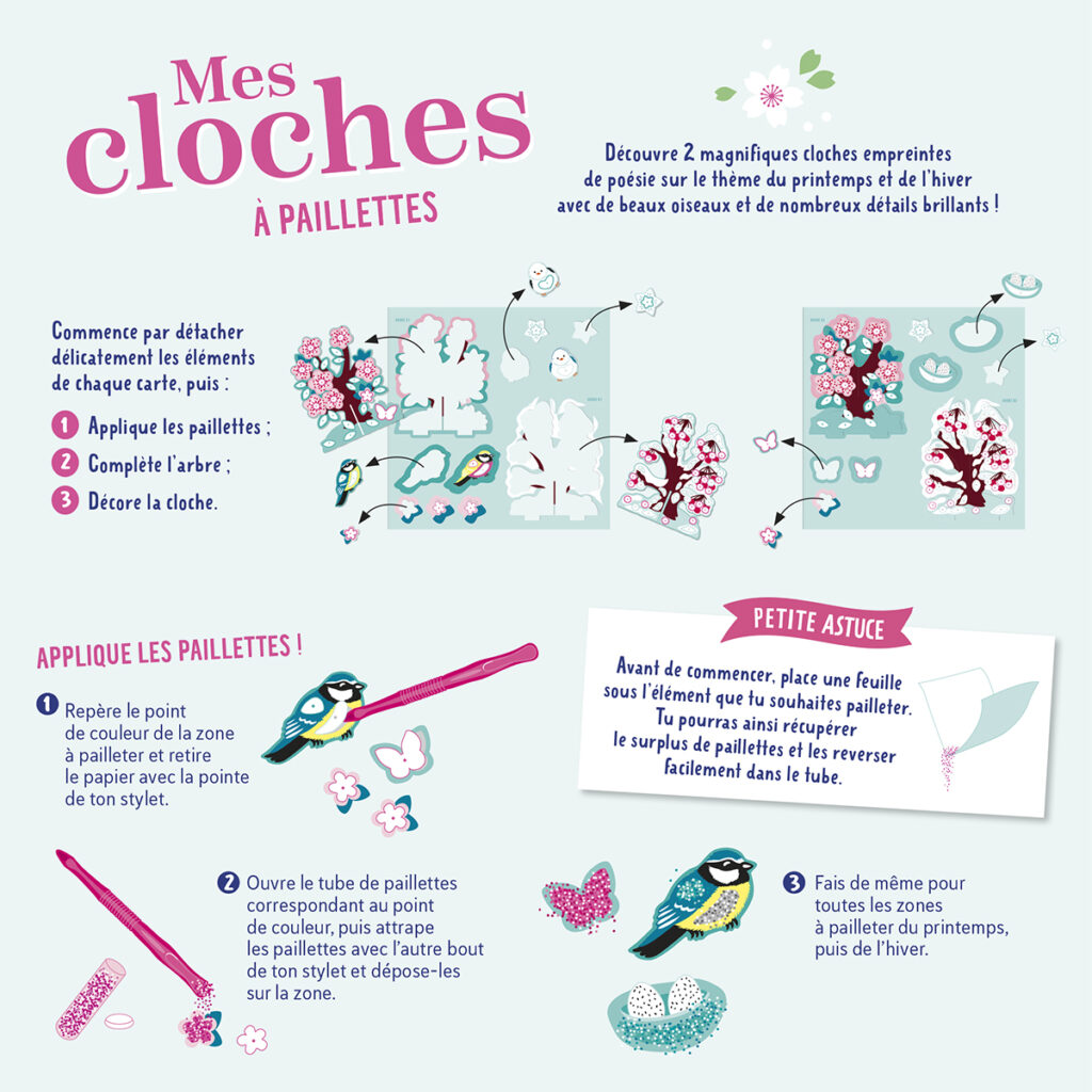 Parution de novembre • Coffret contenant 2 minis cloches à décorer, 2 cartes prédécoupées arbres et oiseaux avec zones à pailleter, stickers papillons et fleurs argentés, 3 tubes de paillettes et confettis étoiles et fleurs scintillants à disséminer au bas des arbres. Design des arbres et oiseaux à monter en 3D + illustrations des pas à pas du livret. Lien site Fleurus