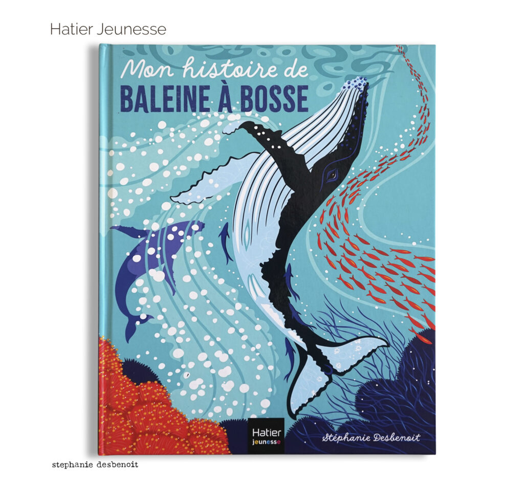 Parution 8 octobre 2025 • Livre de docu/fiction « Mon histoire de baleine à bosse » aux éditions Hatier Jeunesse – Autrice et illustratrice – Un récit illustré du périple aquatique d’une héroïne géante à respecter et à préserver. Une formidable aventure d’écriture et d’illustrations. Grande nouvelle ! l’album est sélectionné en coup de coeur par les éditeurs France Livre, catégorie jeunesse, avec d’autres talentueux ouvrages. Merci au précieux talent de l’équipe éditoriale chez Hatier : Mathilde Obergfell, Audrey Gerard, Bernadette Cossart et Christelle Daubignard. Merci à Caroline Terral qui a initié et soutenu les premières brasses de notre gracieuse baleine ! Bravo à Joséphine de La fabrique graphique paris pour la création graphique. Bonne route à toi ma vaillante baleine et longue vie !