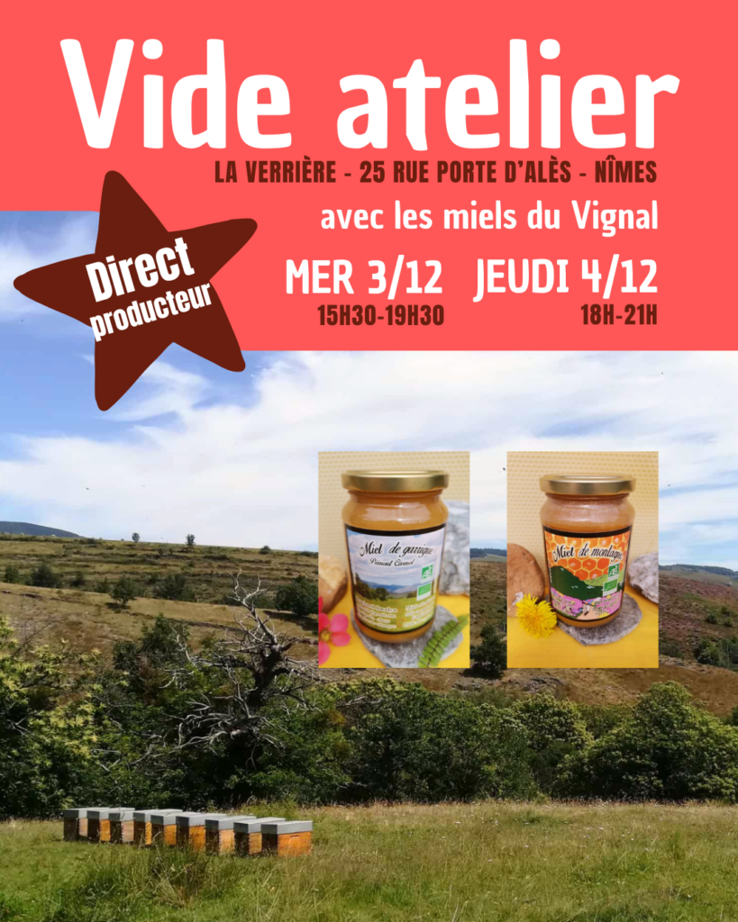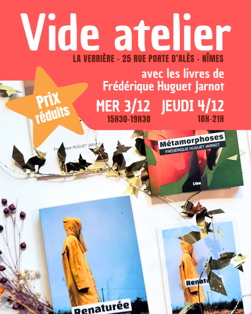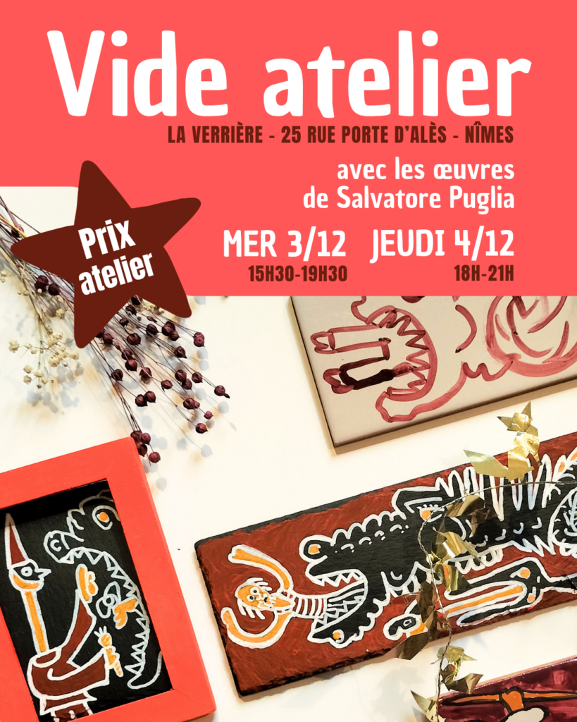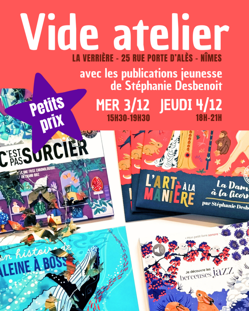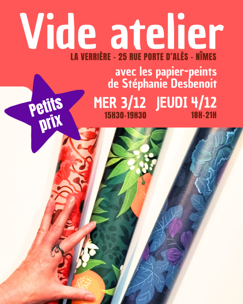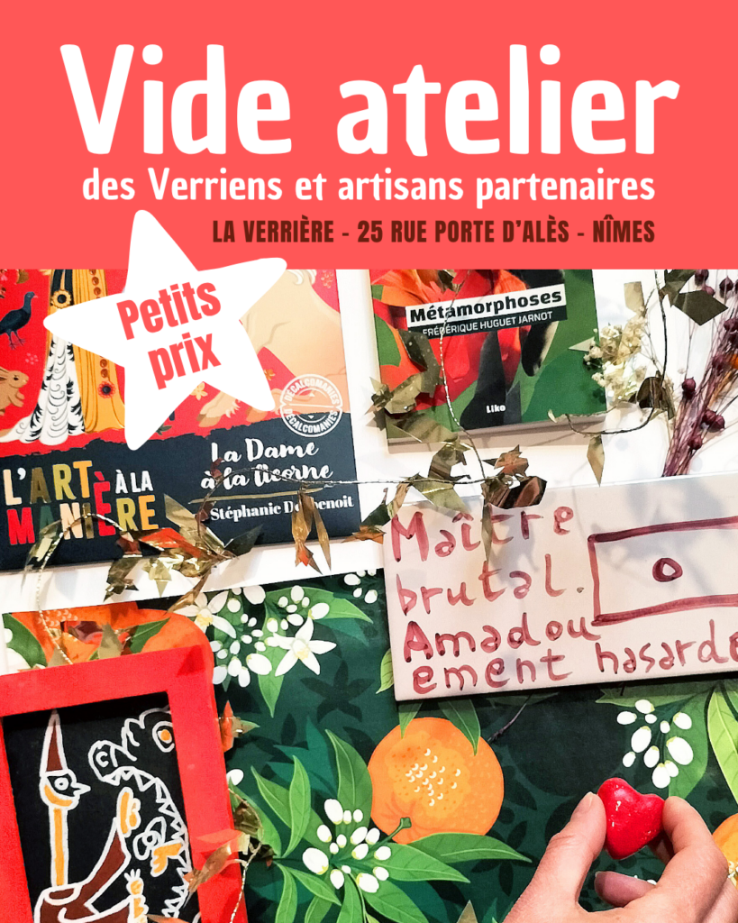 Vide atelier de la Verrière les 3 et 4 décembre 2025. RDV mercredi de 15h30 à 19h30 et jeudi de 18h à 21h. La Verrière, 25 rue Porte d’Alès à Nîmes. Entrée libre. Retrouvez les livres, coffrets créatifs, affiches et papier-peints de Stéphanie Desbenoit Illustration, les livres de Fred Jarnot, autrice, graphiste et rédactrice, les œuvres de Salvatore Puglia, artiste, les cartes cadeaux de Krisje Beaumont, Naturopathe & Co certifiée https://www.facebook.com/profile.php?id=61574934624130, et les miels du Vignal de Jocelyn Brochard, apiculteur récoltant (miel de Lozère en agriculture biologique).